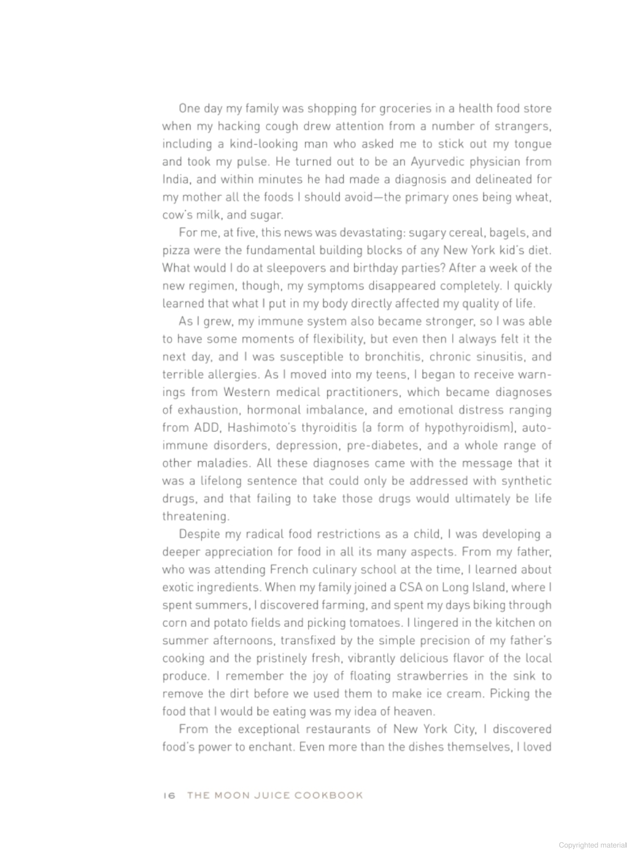 She begins by guiding readers through the fundamentals of the Moon Juice kitchen, teaching them how to stock the larder with milks, juices, cultured foods, and “unbakery” doughs and creams—all of which can be mixed and matched to create nutritionally turbo-charged meals with minimal effort—and the essential time- and money-saving strategies they’ll need to make their new kitchen practices stick.